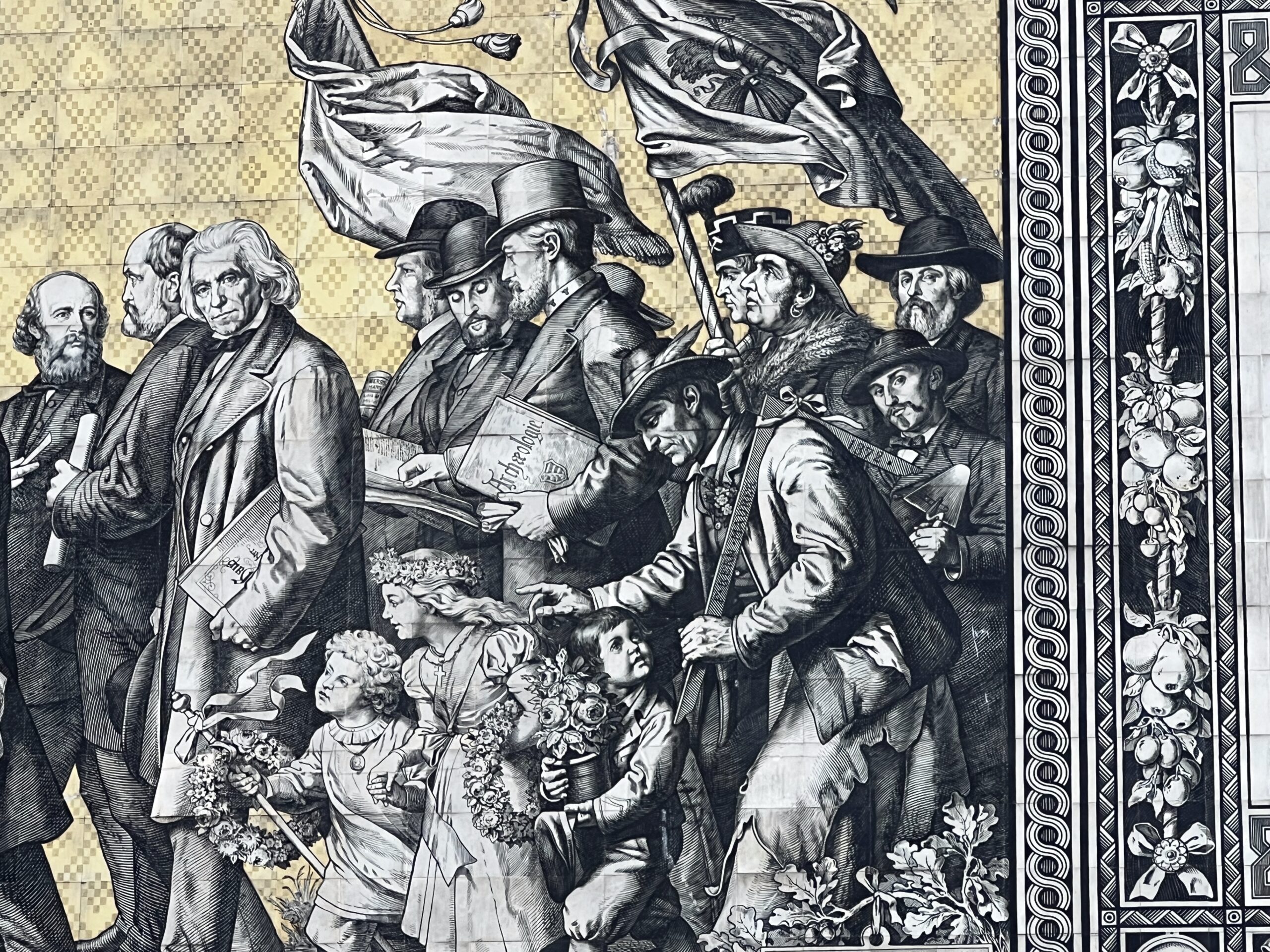 Wenn du das Residenzschloss durch den Schlossplatz in Richtung Elbe verlässt, passierst du automatisch den berühmten Fürstenzug. Dabei handelt es sich um ein 102 Meter langes Wandgemälde an der Außenwand des Langen Gangs, das aus über 24.000 Meißner Kacheln besteht und die sächsischen Herrscher in einem feierlichen Reiterzug darstellt. Das Gemälde entstand ursprünglich im Jahr 1876 und wurde zwischen 1904 und 1907 auf Meißner Porzellan übertragen, das dann wie durch ein Wunder jegliche Bombenangriffe überstand. Die schiere Länge und der Detailreichtum des Fürstenzugs sind verblüffend. Übrigens hat am Ende des Fürstenzugs der Maler selbst verewigt, in unserem Video über Dresden kannst du darüber noch mehr erfahren.